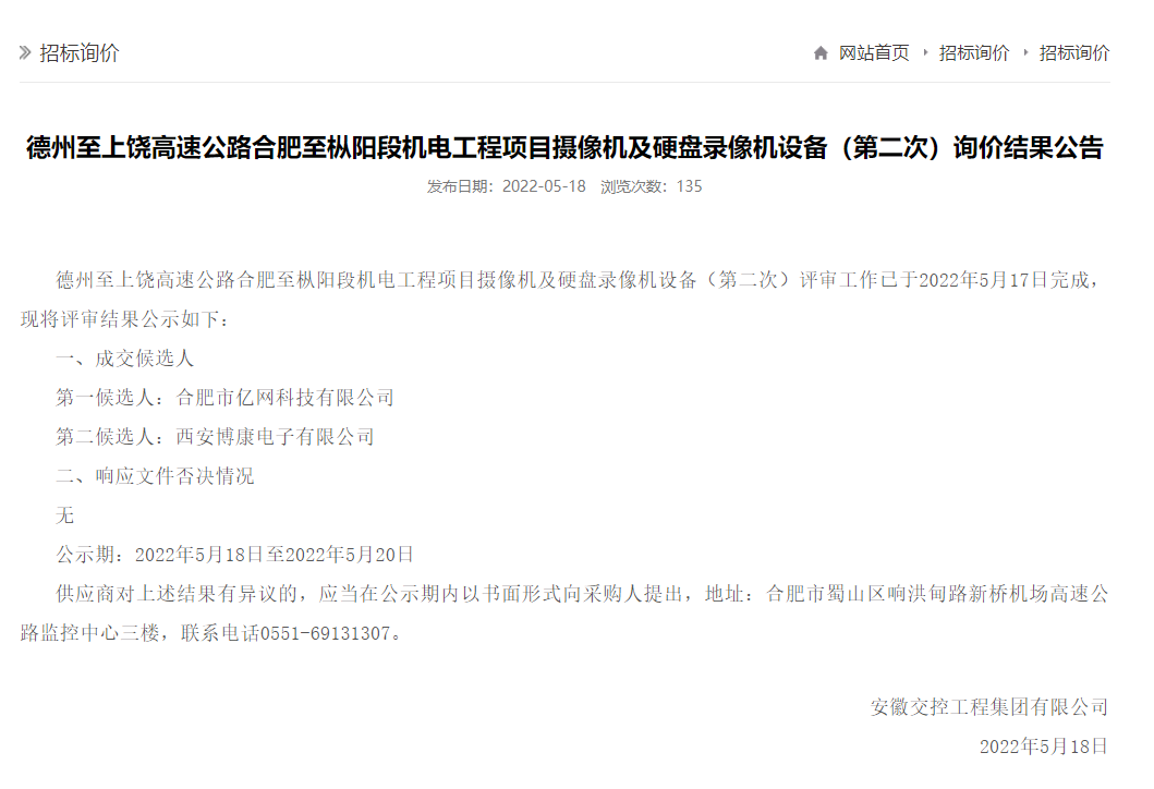 5月18日,再傳捷報,合肥市億網(wǎng)科技有限公司在眾多的競爭者中經(jīng)過公司各部門相關(guān)人員團結(jié)一致、齊心努力,憑借過硬的技術(shù)實力、良好的信譽和豐富的項目經(jīng)驗贏得了業(yè)主和評標委員會的肯定,我公司在競標中兩次擊敗競爭對手,最終中得安徽交控工程集團有限公司《德州至上饒高速公路合肥至樅陽段機電工程項目》。