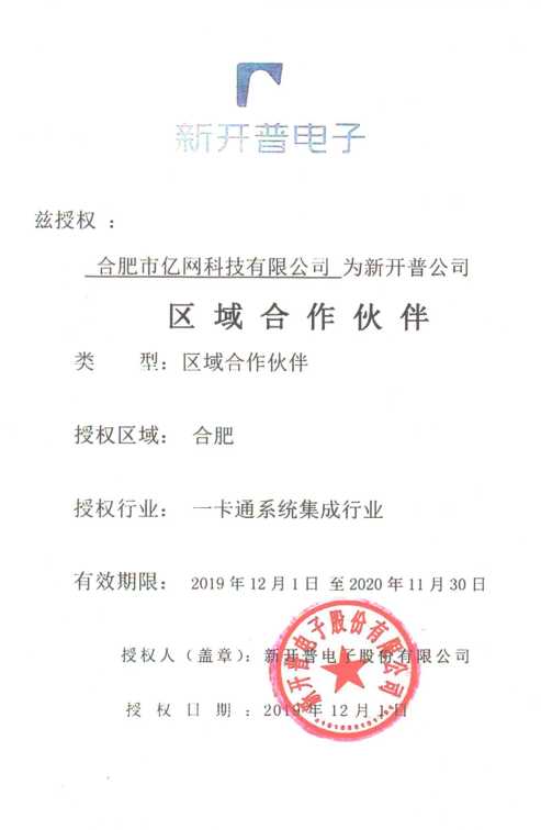 合肥市億網(wǎng)科技有限公司與新開普電子股份有限公司達成合作伙伴關(guān)系